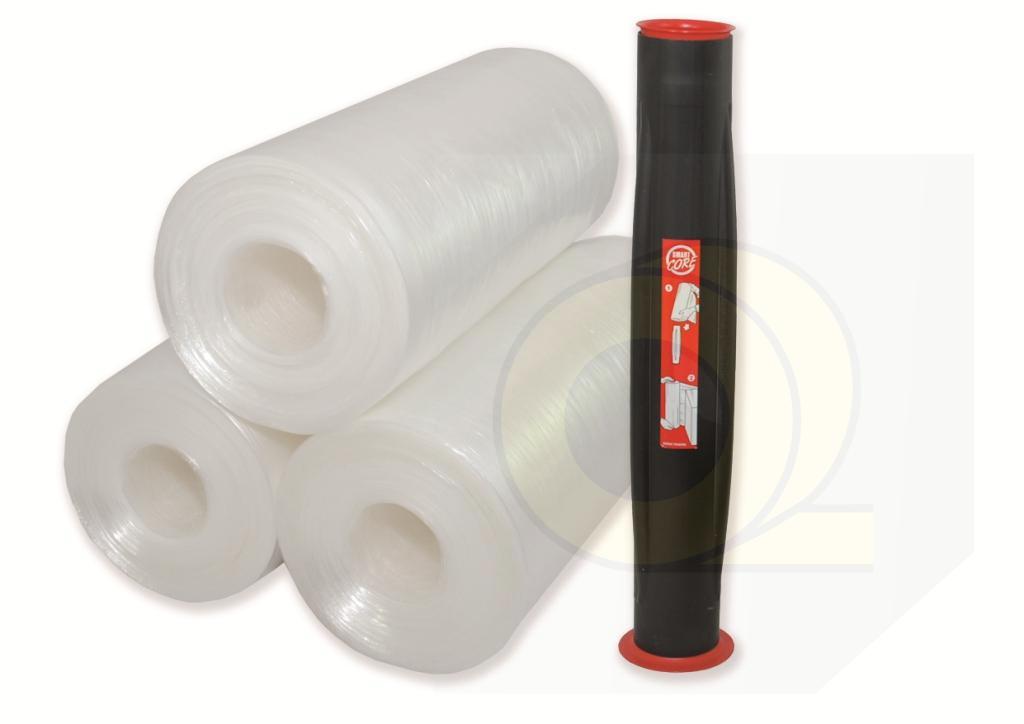 | 04-9420 | Stärke: 20 µ Breite: 500 mm Länge: 1.800 m Kern: 76 mm / 1,0 kg Qualität: 350 % Pre-Stretch Merkmale: innen haftend / außen gleitend Gewicht: 17,56 kg (brutto) Palette: 30 Ro. |